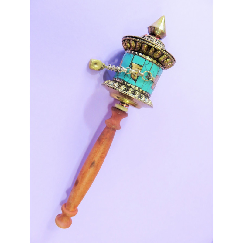 Moulin tibétain de prières en métal doré de 22 cm, recouvert de turquoise, avec Mantras incrustés et manche en bois. A noter que le simple faît de faire tourner ce moulin est considéré comme une Prière en soi mais c'est aussi une manière pour ceux qui ne savent ni lire, ni écrire, de Prier, tout simplement !