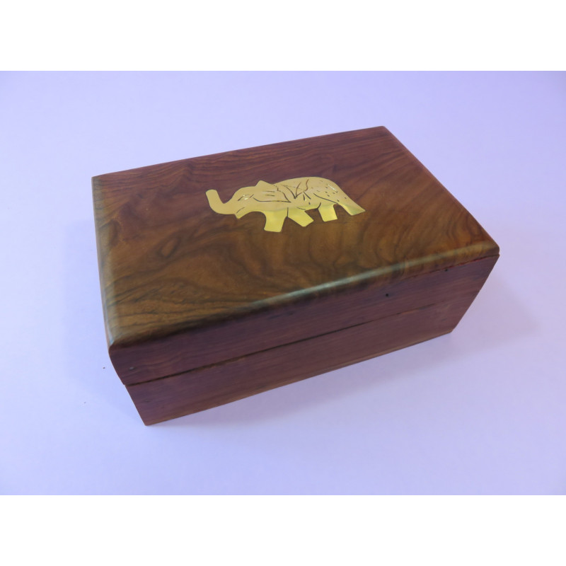 Boîte en bois précieux de Sheesham de 15x10x6 cm avec Eléphant en cuivre incrusté sur le dessus pour des cartes de tarot ou autre(s). Fait en INDE par artisan.