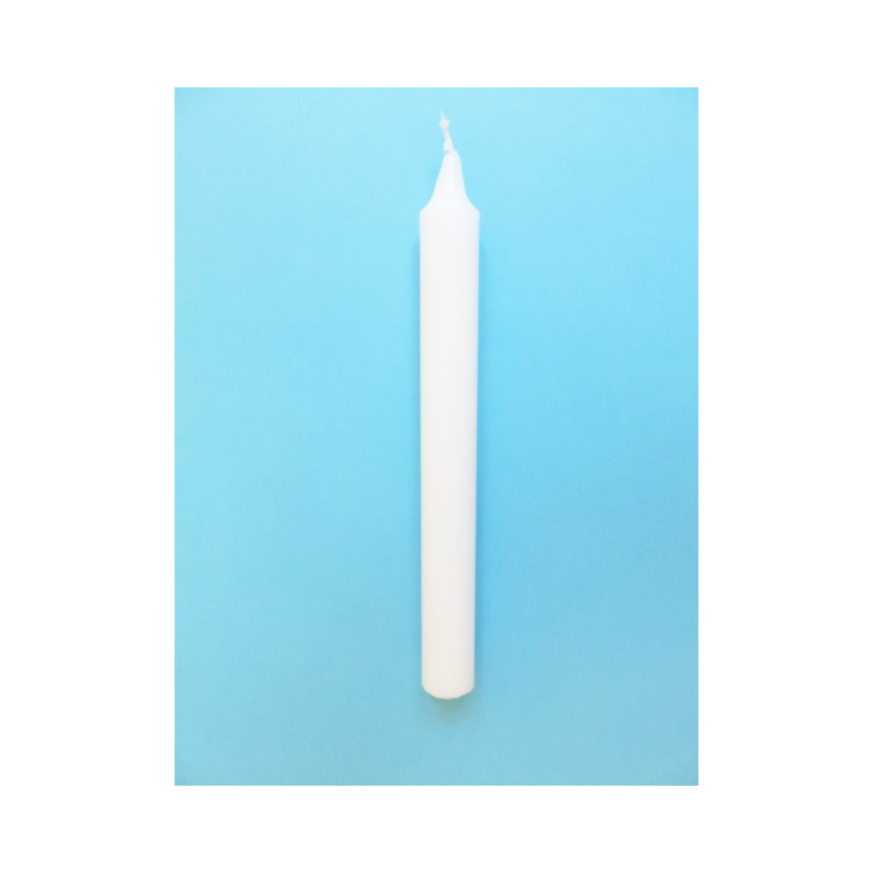 Bougie blanche de 20 cm de hauteur hors mèche, 2 cm de diamètre, poids de 59 gr, durée de combustion d'environ 8 heures, composée de paraffine et d'une mèche en cotton pur. Ne coule pas.