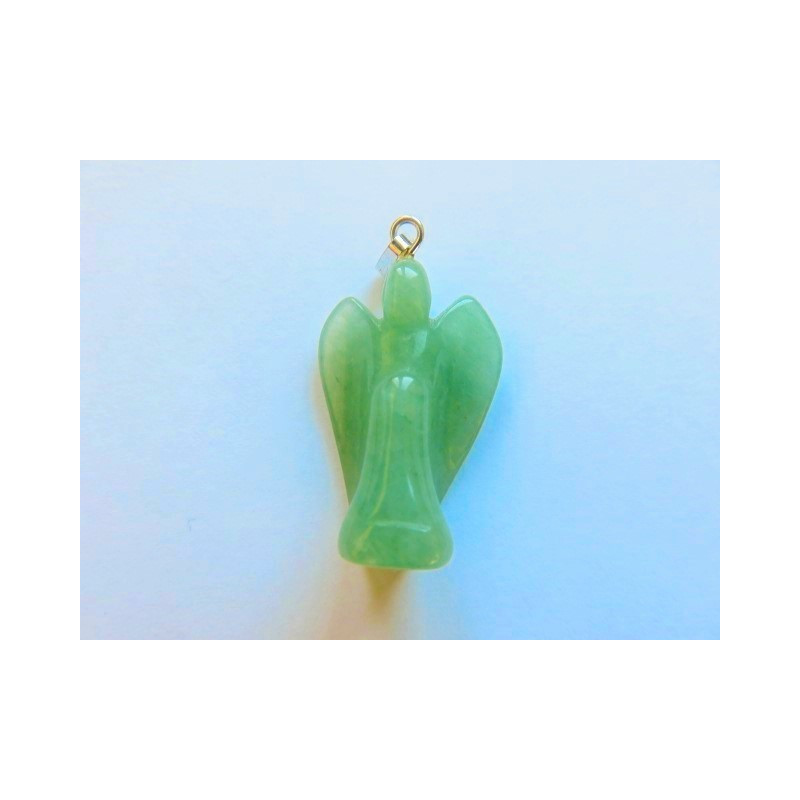 Pendentif Ange en Aventurine de 2,5 cm de hauteur, 3,3 crochet et anneau inclus, 1,7 dans sa partie la plus large (ailes) et 0,8 à la base, épaisseur de +/- 1 cm, poids: 4,5 g.