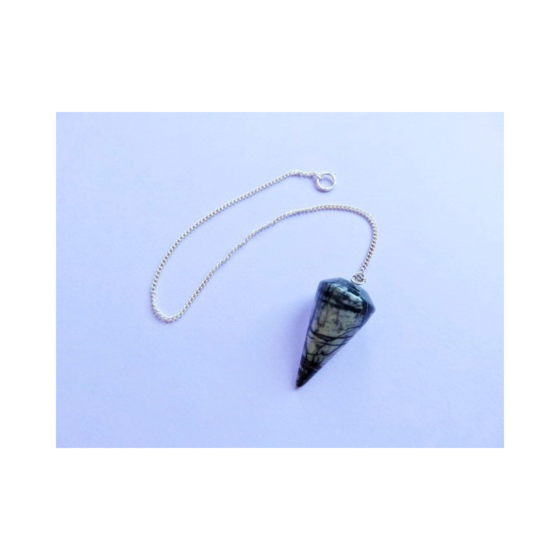 Pendule en Obsidienne mouchetée conique de 3,6 cm de hauteur sur 1,7 dans sa partie la plus large, chaînette de 21 cm, poids total de 10 gr.