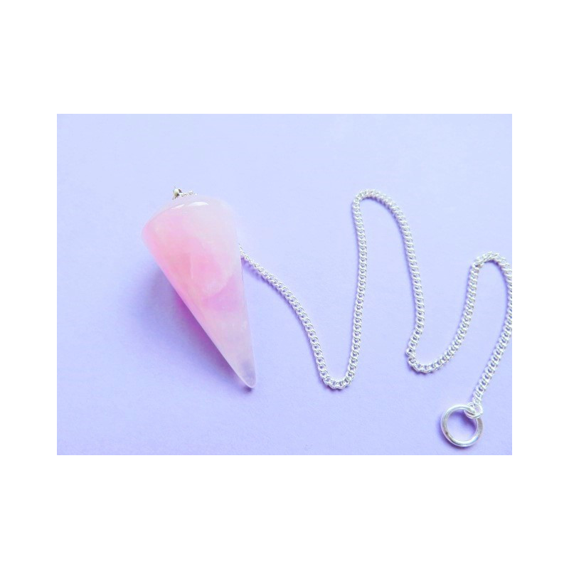 Pendule en quartz rose conique de 4 cm de hauteur sur 1,8 dans sa partie la plus large, chaînette de 21 cm, poids total de 12 gr.